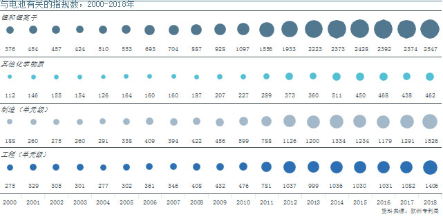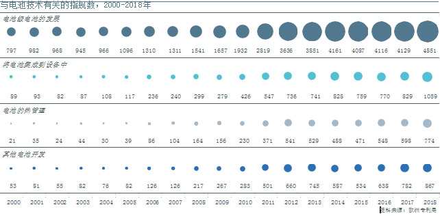 在電池技術(shù)領(lǐng)域,自2000年以來(lái)的技術(shù)發(fā)展主要得益于電池單元層面的創(chuàng)新。2014年至2017年間,與電池相關(guān)的IPF數(shù)量停滯在每年約4100個(gè),2018年與電池相關(guān)的IPF數(shù)量增加到4851(+17.5%),幾乎占當(dāng)年所有電池相關(guān)發(fā)展的四分之三。其他顯著的發(fā)展包括自2000年以來(lái)在電池?zé)峁芾砗碗姵嘏c設(shè)備集成方面取得的技術(shù)進(jìn)步,這兩項(xiàng)技術(shù)都是促進(jìn)電池在新工業(yè)中使用的關(guān)鍵應(yīng)用程序。