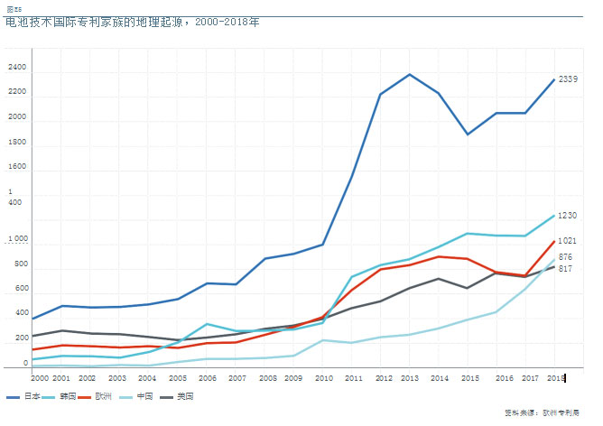 對(duì)IPFs地理來(lái)源的更廣泛分析證實(shí)了日本在電池技術(shù)方面的強(qiáng)大領(lǐng)導(dǎo)地位。日本在2000年代已經(jīng)在世界范圍內(nèi)鋪平了道路,但在過(guò)去十年中進(jìn)一步加強(qiáng)了其領(lǐng)先地位??偛吭O(shè)在日本的公司和發(fā)明家在2018年創(chuàng)造了所有與電池相關(guān)的IPF的三分之一以上。
