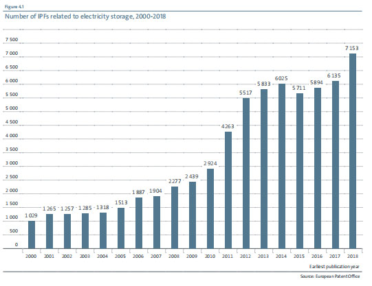 然而,增長(zhǎng)率并不是一成不變的。電力存儲(chǔ)中的IPF數(shù)量在2012年之前呈指數(shù)級(jí)增長(zhǎng),隨后幾年趨于穩(wěn)定。2018年可以觀察到進(jìn)一步的增長(zhǎng)動(dòng)力,增長(zhǎng)16.6%??傮w而言,2000年至2018年,與電力儲(chǔ)存相關(guān)的IPF數(shù)量年增長(zhǎng)了7倍,而同期所有部門(mén)的每年IPF數(shù)量?jī)H翻了一番。