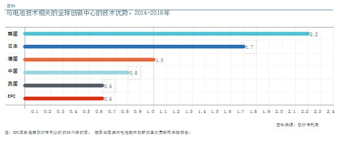 對(duì)于2014-2018年,這一指標(biāo)揭示了在電池技術(shù)創(chuàng)新競(jìng)賽中領(lǐng)先的區(qū)域之間的鮮明對(duì)比。韓國(guó)和日本在這一領(lǐng)域有著非常強(qiáng)大的專(zhuān)業(yè)化,而美國(guó)、中國(guó)和歐洲國(guó)家則不那么專(zhuān)業(yè)化。
