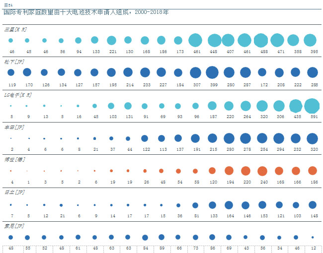 在與電池相關(guān)的IPF背后的十大全球申請(qǐng)者中,有九個(gè)位于亞洲。其中包括由松下和豐田領(lǐng)導(dǎo)的七家日本公司,以及兩家韓國(guó)公司三星和LG電子。博世,一家德國(guó)公司,是唯一的非亞洲申請(qǐng)人的排名。從2014年到2018年,僅日本就擁有所有鋰離子專(zhuān)利活動(dòng)41%的發(fā)明者。