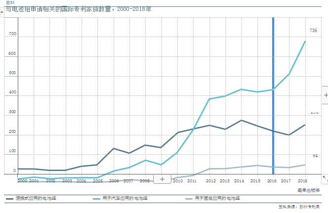 數(shù)據(jù)表明,汽車(chē)行業(yè)落后于電池組相關(guān)發(fā)明活動(dòng)的增長(zhǎng),特別是在2009年之后。2011年,這一領(lǐng)域的發(fā)明活動(dòng)超過(guò)了將電池集成到便攜式應(yīng)用的相關(guān)領(lǐng)域,而在這之前,便攜式應(yīng)用一直是領(lǐng)先的應(yīng)用領(lǐng)域。2017-2018年,與電動(dòng)汽車(chē)相關(guān)的創(chuàng)新活動(dòng)恢復(fù)增長(zhǎng),共記錄了736個(gè)IPF。固定應(yīng)用方面的發(fā)展一直是三個(gè)應(yīng)用領(lǐng)域中最小的,但在很大程度上停滯不前。