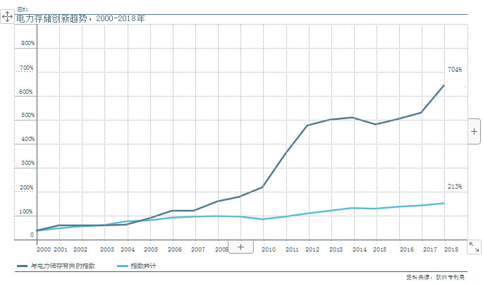 電能存儲(chǔ)的創(chuàng)新在很大程度上由電化學(xué)技術(shù)即電池的進(jìn)步所主導(dǎo),在2000年至2018年期間,與電能存儲(chǔ)相關(guān)的十分之九的IPFS都是電池。第二重要的類(lèi)別,電氣儲(chǔ)能,在同一時(shí)期占所有電力儲(chǔ)存IPF數(shù)量的另外9%。這一類(lèi)包括超導(dǎo)儲(chǔ)能和超級(jí)電容器,它們的能量密度有限,但功率密度和效率比電池高,被用于電動(dòng)汽車(chē)或電網(wǎng)管理的快速充放電應(yīng)用。