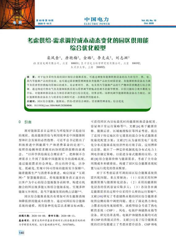 LUAN Fengkui, TANG Yanmei, JIN Lu, et al. The collaborative optimization model of park energy supply and use considering the change of supply - demand regulation cost[J]. Electric Power, 2020, 53(10): 140-148.