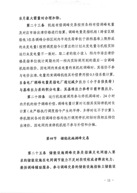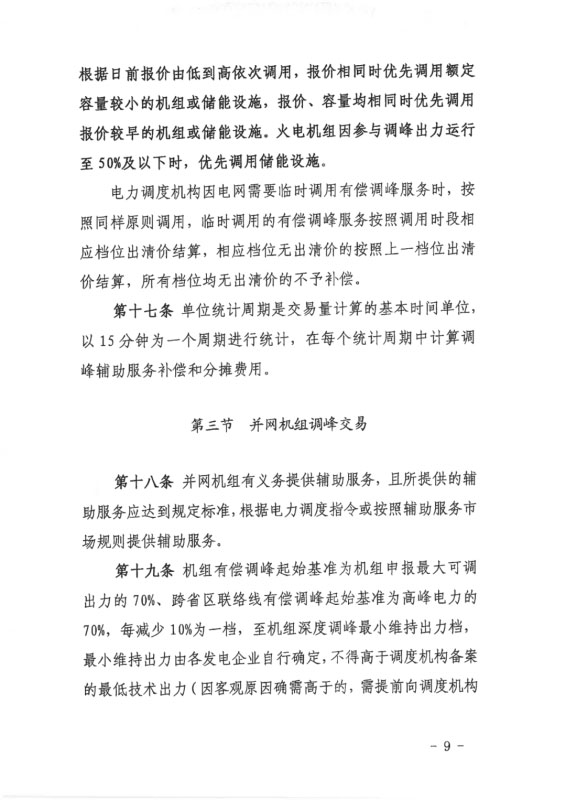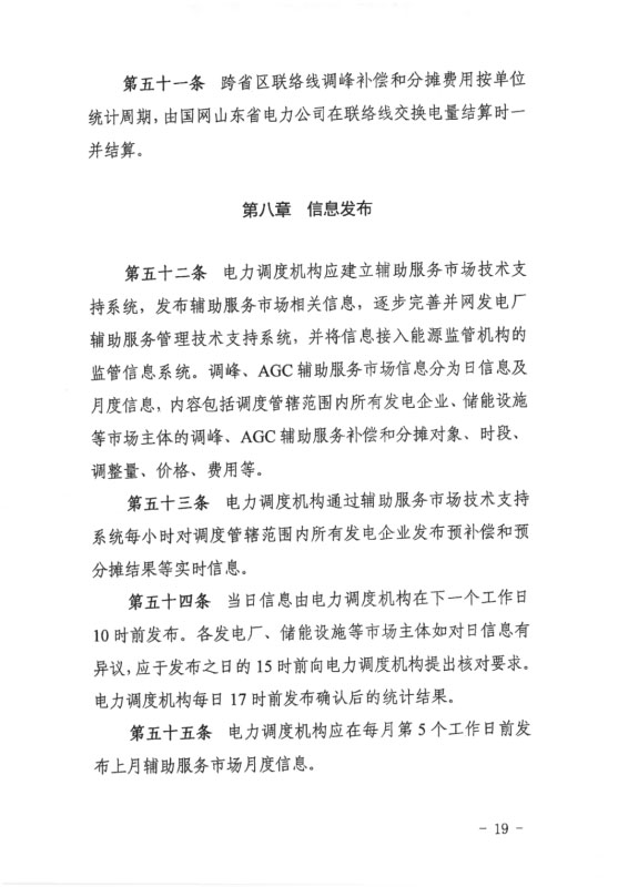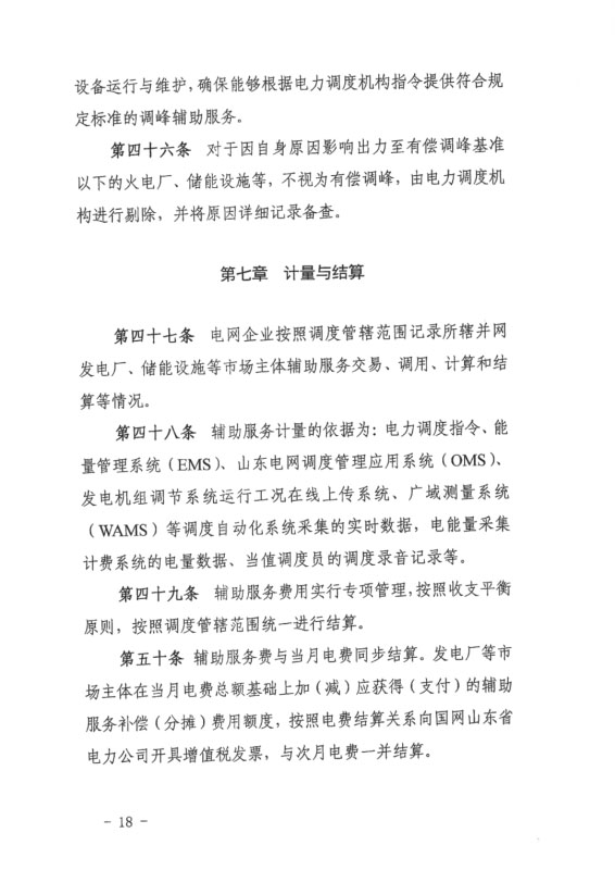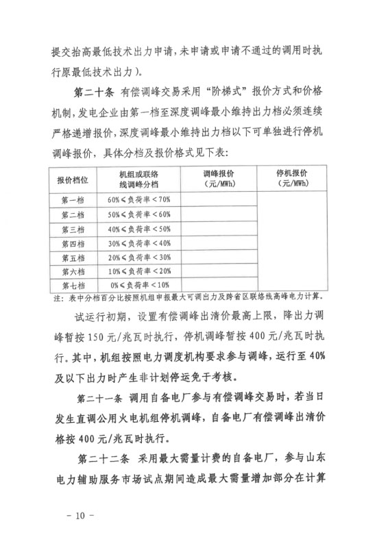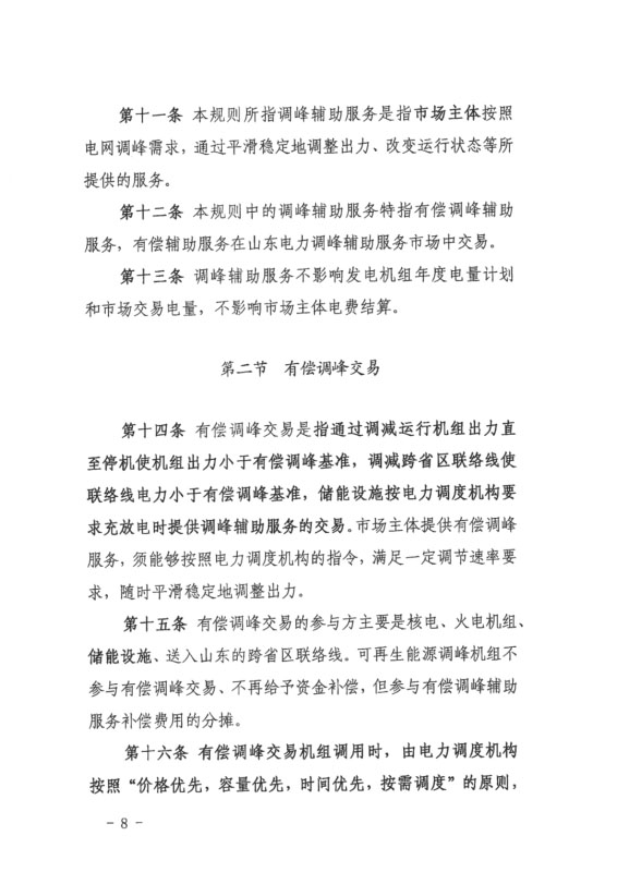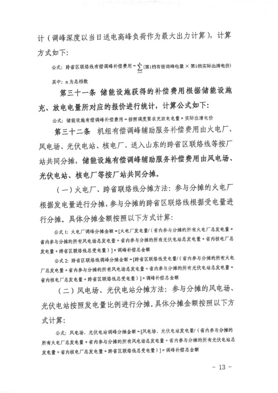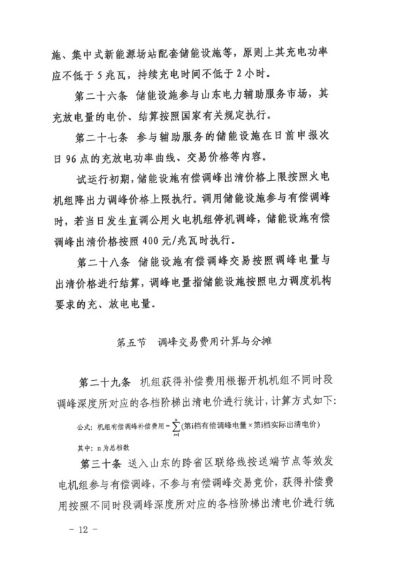 儲能設施參與山東電力輔助服務市場,其充放電量的電價、結算按照國家有關規(guī)定執(zhí)行。調用儲能設施參與有償調峰時,若當日發(fā)生直調公用火電機組停機調峰,儲能設施有償調峰出清價格按照400元/MWh執(zhí)行。儲能設施有償調峰輔助服務補償費用由風電場、光伏電站、核電廠等按場站共同分攤。有償調峰交易機組調用時,火電機組因參與調峰出力運行至50%及以下時,優(yōu)先調用儲能設施。