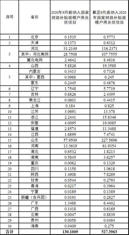 根據(jù)各省級(jí)能源主管部門、電網(wǎng)企業(yè)報(bào)送信息,經(jīng)國(guó)家可再生能源信息管理中心梳理統(tǒng)計(jì),2020年9月新納入國(guó)家財(cái)政補(bǔ)貼規(guī)模戶用光伏項(xiàng)目總裝機(jī)容量為130.1萬(wàn)千瓦。截至2020年9月底,全國(guó)累計(jì)納入2020年國(guó)家財(cái)政補(bǔ)貼規(guī)模戶用光伏項(xiàng)目裝機(jī)容量為527.4萬(wàn)千瓦。詳細(xì)情況見(jiàn)附表。