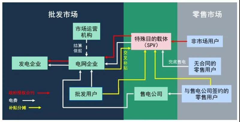 其次是通過特殊目的載體(SPV)簽訂政府授權合約,構建獨立透明的過渡機制。特殊目的載體(Special Purpose Vehicle,SPV)是一個為特定目的而構造的空殼實體,SPV常被設立者用于隔離財務風險。因為通過SPV可以獨立透明地實現(xiàn)清潔能源補貼、非市場用戶保障等政策目標,SPV在市場化改革的過渡過程中被廣泛使用,例如新加坡設立了政府指定的MSSL公司用于“計劃”向市場的過渡,并與各類受補貼的主體簽訂政府授權合約。SPV的特點是運營目的單一,且與發(fā)起人完全隔離,無任何資金或債務關聯(lián)。此外,SPV獨立實體的特點還方便了監(jiān)管機構對相關過渡機制的監(jiān)管和審計,使得市場主體對改革過渡機制的信任可以極大地提升。針對國內實際,市場起步初期可由電網企業(yè)成立專門的空殼子公司作為SPV或采用獨立賬戶的形式代替SPV。
