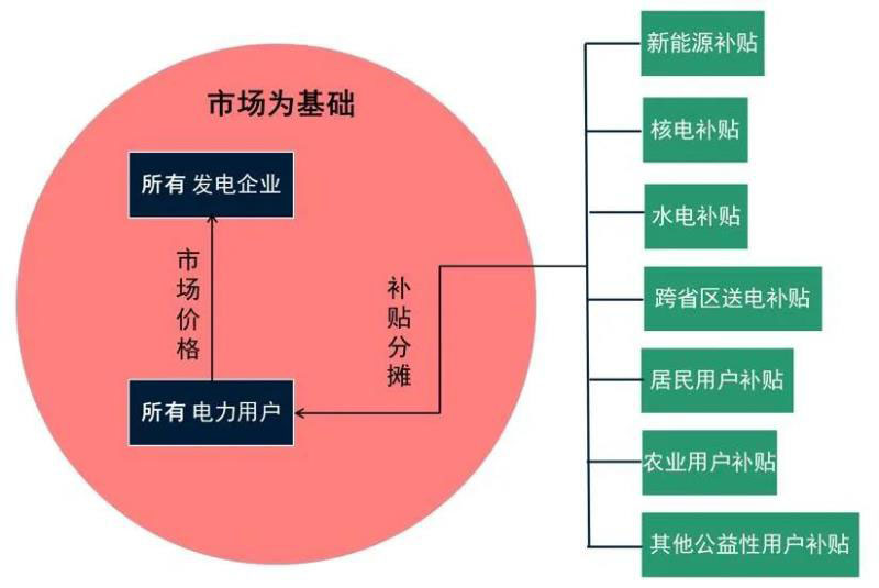 當前電力市場化改革中,部分核電、水電、新能源以及跨省區(qū)送受電暫時未放開參與市場競爭,仍在沿用計劃體系下固定上網電價模式(Feed-in-Tariff,F(xiàn)iT)運行。這種模式有兩個特點,一是機組的發(fā)電量不隨市場供需調整,二是結算不按照市場價格而是按照政府核定的固定電價。特點一導致非市場化發(fā)電量與優(yōu)先用電量無法實時對等,即使在總發(fā)用電量平衡的前提下,市場化發(fā)用電量也無法對等,進而產生了資金余缺。受特點二影響,現(xiàn)貨市場價格越低,現(xiàn)貨市場價格與要支付的固定價格之間的差額就越大,需要的額外補貼額越高,這會進一步放大資金余缺。這兩部分資金余缺就是所謂的“雙軌制不平衡資金”,如果我們再把可再生能源附加和上述雙軌制不平衡資金疊加在一起,這個巨大的補貼資金池其實可以分解為廣義上的“新能源補貼+核電補貼+水電補貼+跨省區(qū)送受電補貼+省內供熱等優(yōu)先發(fā)電補貼”。