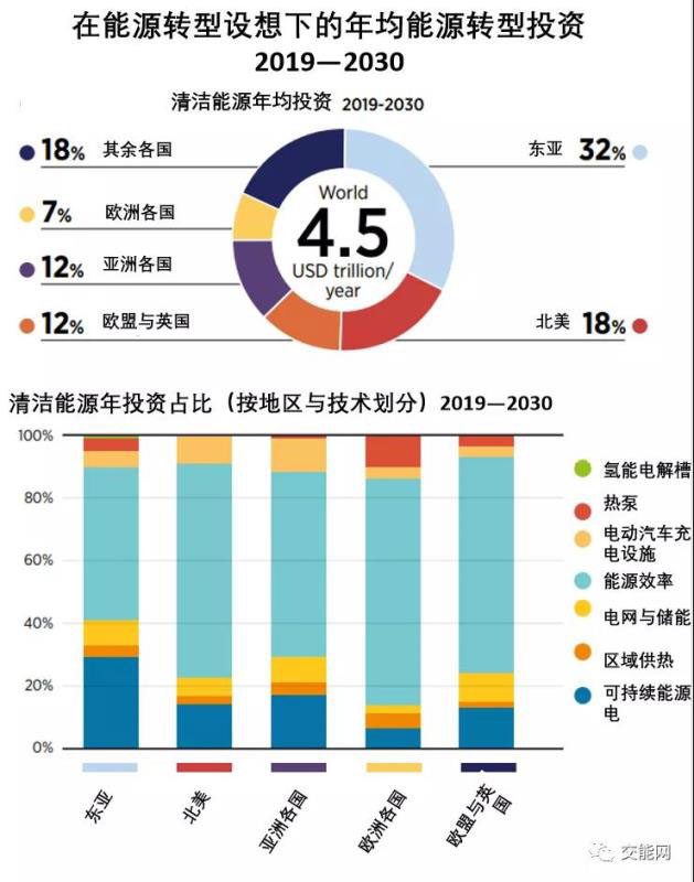 對能源轉型的投資是復蘇一攬子計劃中一個重要的部分。使得在未來三年及以后提振經濟的同時,在廣泛的職業(yè)中創(chuàng)造就業(yè)機會。"能源轉型設想"指出,從現(xiàn)在起到2030年,能源部門在可再生能源和能源效率方面累計投資必須上升到49萬億美元。因此意味著到2030年,在可再生能源、能源效率和低碳促進技術方面每年的投資約為4.5萬億美元,包括電網(wǎng)和存儲等基礎設施。這一數(shù)字是2019年可再生能源技術、能源效率和電網(wǎng)(包括存儲系統(tǒng))投資8250億美元的5倍以上。這將意味著投資需求的數(shù)量和投資需求類型的改變,因為對能源過渡的投資,使基礎設施和能源效率增加,而礦物燃料供應的投資減少。