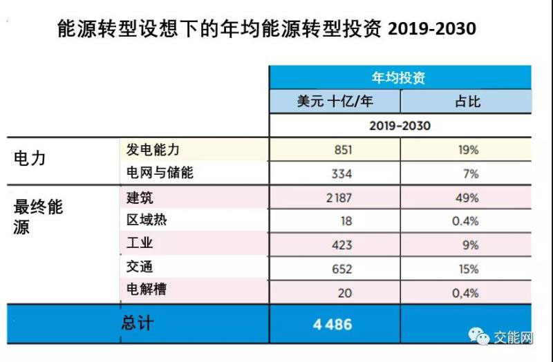 表中將可再生能源和能源效率方面所需的全球投資分解為幾個主要組成部分。2019年至2030年,每年44860億美元,相當于2019年全球GDP的近5.4%。
