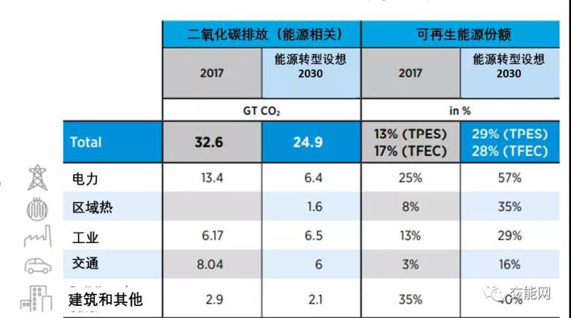 "能源轉型設想"將二氧化碳排放量減少至與全球氣候和能源目標一致的水平。但要實現(xiàn)這個目標,需要實現(xiàn)能源供需的改變。 利用可再生能源成為世界能源系統(tǒng)脫碳的先決條件。根據(jù)"能源轉型設想",到2030年,可再生能源將提供全球發(fā)電量的57%,而2017年為25%(預計2020年為30%)。風能和太陽能光伏發(fā)電在發(fā)電量方面將占據(jù)主導地位,到2030年,全球三分之一的電力來自太陽能和風能。到2030年,建筑部門在可再生能源中所占的份額將最高(40%,所有傳統(tǒng)生物燃料的使用將逐步淘汰)(見下表)。第二高的可再生能源份額將是在工業(yè)(包括高爐和焦爐),到2030年,可再生能源將占29%的份額。交通運輸業(yè)所占份額最低,但增長最大,從2017年的3%攀升到2030年的16%。