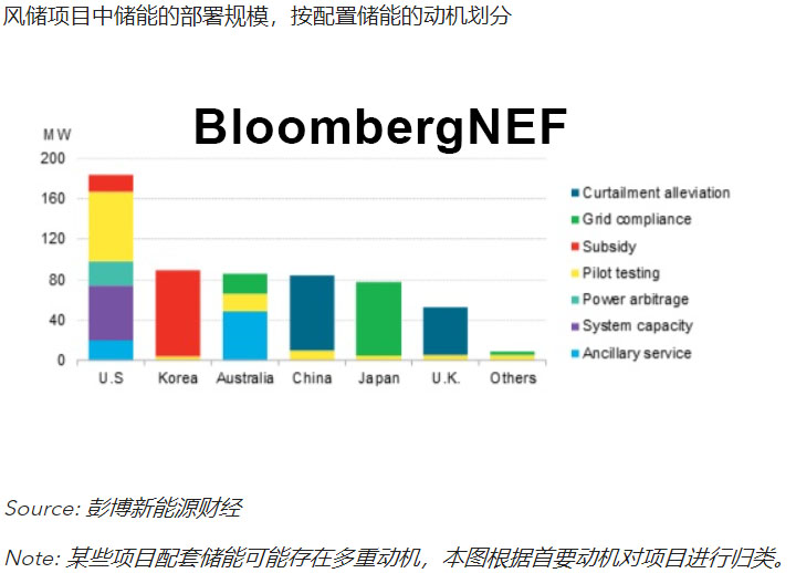 截至2019年,全球風(fēng)儲(chǔ)項(xiàng)目中儲(chǔ)能的累計(jì)部署規(guī)模