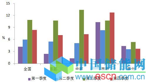 圖3 2013年各地區(qū)分季度全社會用電量增速情況圖