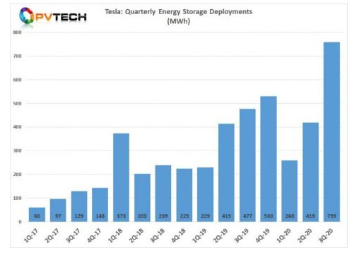 特斯拉公司在其2020年第三季度的財務(wù)業(yè)績報告中指出,該公司儲能產(chǎn)品的部署和銷售量顯著增加,第三季度達(dá)到759MWh。這與第二季度相比增長了81%,比去年同期相比增長了59%。特斯拉公司預(yù)計,用戶采購儲能系統(tǒng)的需求在2021年將超過供應(yīng)量。再加上住宅太陽能系統(tǒng)的部署量比上一季度翻了一番,該公司的住宅太陽能和儲能系統(tǒng)在2020年第三季度的收入為5.79億美元,同比增長44%。