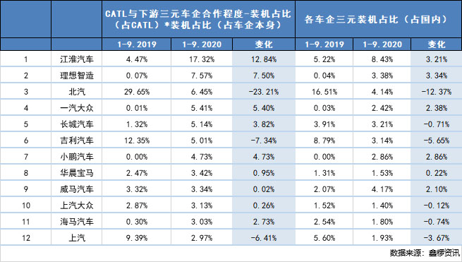 表:2019-2020年CATL下游三元車企占比(占國內(nèi))
