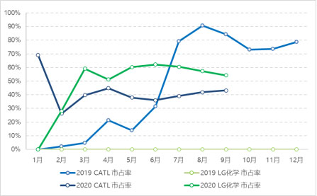 圖:2019-2020年CATL與LG化學國內(nèi)高鎳市占率對比圖