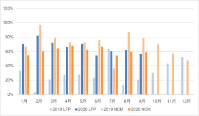 而LG化學19年在國內(nèi)高鎳市場裝機都為0,2020年開始情況有所改變。隨著LG化學給特斯拉供應NCM811電池,LG化學的市占率迅速提升達28%,3月開始市占率均維持在50%以上,從1-9月數(shù)據(jù)來看,LG化學今年在國內(nèi)的市占率全年有望超過50%。因為LG化學高鎳市占率的迅速提升,CATL高鎳市占率受到擠壓,預計全年市占率略低于LG化學達47%左右。