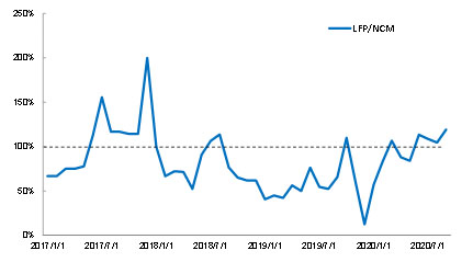 2020年在對三元高鎳的“不友好”氣氛下,市場一度過于悲觀,認為高鎳三元比例不會過高,但從CATL的數(shù)據(jù)來看,2020年1-9月高鎳平均市占率也能達到42%。