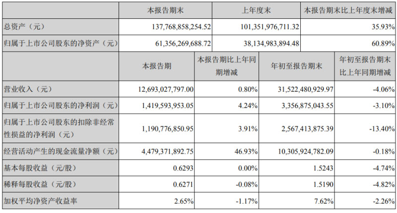 中國儲能網(wǎng)訊:10月27日,寧德時代發(fā)布2020年第三季度業(yè)績報告。該季度營收126.93億元,同比增長0.8%;凈利潤14.20億元,同比增長4.24%;今年前三季度,寧德時代營收315.22億元,同比下降4.06%;凈利潤33.57億元,同比下降3.10%。