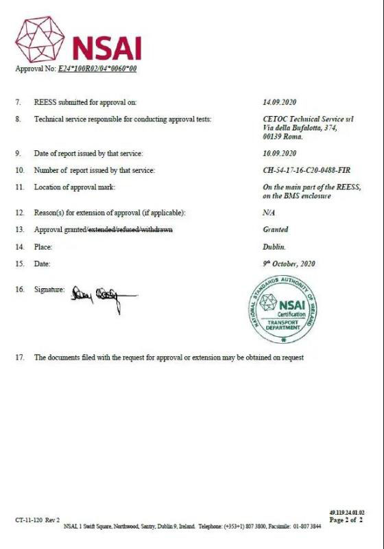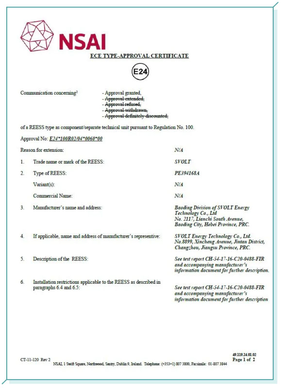此次頒發(fā)的電池包E-Mark證書(E24)為愛爾蘭交通部授予,愛爾蘭交通部屬于歐洲經(jīng)濟(jì)委員會(huì)(Economic Commission for Europe, 簡稱ECE)成員國的政府部門。凡產(chǎn)品進(jìn)入歐洲市場前必須取得此認(rèn)證,并可以在所有成員國市場都能進(jìn)行銷售。
