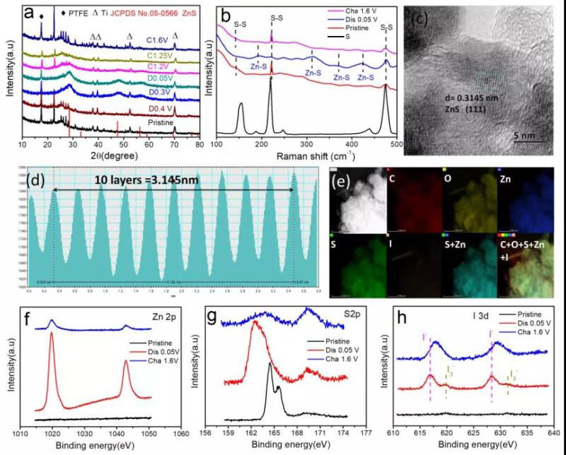 圖4 S@CNTs-50電極的充放電產物的結構表征。(a)不同電位下XRD圖譜,(b)不同電位下Raman光譜,(c,d)放電下產物的TEM照片和晶面層間距,(e)放電產物的TEM mapping, 和(f-g)不同狀態(tài)下的XPS圖譜 。