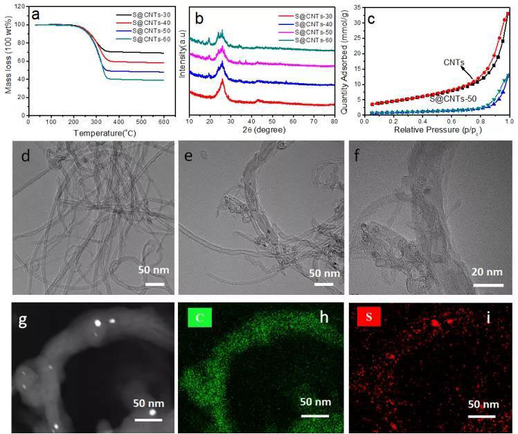 圖1 樣品的結構表征。不同硫碳復合材料的(a)TG和(b)XRD圖譜。(c)S@CNTs-50和CNTs的氮氣吸脫附曲線,(d)CNTs 的TEM照片,(e,f)S@CNTs-50 的TEM照片,和(g-h)S@CNTs-50的TEM mapping。