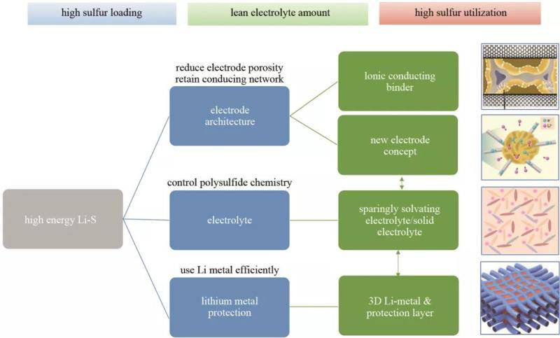 鋰硫電池所面臨的挑戰(zhàn)與鋰硫電池中特殊的化學(xué)反應(yīng)相關(guān):一方面,鋰硫電池的快速可逆反應(yīng)需要依賴(lài)溶解的多硫化鋰作為反應(yīng)媒介,提高硫正極的反應(yīng)動(dòng)力學(xué);另一方面,多硫化鋰的溶解又是鋰硫電池中各種困難問(wèn)題產(chǎn)生的原因,如“穿梭”效應(yīng)、正極硫的重新分布、金屬鋰的腐蝕等。單一的方案可能難以全面解決鋰硫電池的問(wèn)題,需要從硫電極結(jié)構(gòu)、電解液(質(zhì))及金屬鋰保護(hù)多方向協(xié)作開(kāi)發(fā)出能將三者有機(jī)結(jié)合,充分發(fā)揮相互優(yōu)勢(shì)的鋰硫電池體系,如圖6所示。①有效降低硫正極的孔隙率,同時(shí)維持穩(wěn)定的離子/電子導(dǎo)電網(wǎng)絡(luò);②合理調(diào)節(jié)多硫化鋰的化學(xué)行為;③高效、可逆利用金屬鋰負(fù)極是實(shí)現(xiàn)高能量鋰硫電池的重要研究方向。例如,通過(guò)開(kāi)發(fā)與鋰硫電池電極材料兼容的具有離子導(dǎo)電或電子導(dǎo)電能力的黏結(jié)劑以降低導(dǎo)電碳含量和電解液用量;設(shè)計(jì)新的硫正極結(jié)構(gòu)、表面性質(zhì)從而有效控制硫化物反應(yīng)路徑;探索與硫正極結(jié)構(gòu)配套的全新的電解液體系,實(shí)現(xiàn)從微觀/宏觀多尺度上對(duì)硫正極反應(yīng)熱力學(xué)和動(dòng)力學(xué)過(guò)程的有效調(diào)控;開(kāi)發(fā)3D金屬鋰負(fù)極或合金復(fù)合負(fù)極材料提高金屬鋰負(fù)極的化學(xué)、電化學(xué)及結(jié)構(gòu)穩(wěn)定性;開(kāi)發(fā)全新的固態(tài)鋰硫電池體系從根本上提高硫正極和鋰負(fù)極的均勻性和穩(wěn)定性,解決多硫化鋰溶解、界面鈍化、鋰枝晶及“死鋰”等問(wèn)題。此外,未來(lái)探索出鋰硫電池研究的標(biāo)準(zhǔn)參數(shù),可能有益于加速將鋰硫電池在新型電極結(jié)構(gòu)及電解液(質(zhì))等方向的研究結(jié)果轉(zhuǎn)化為實(shí)際應(yīng)用。
