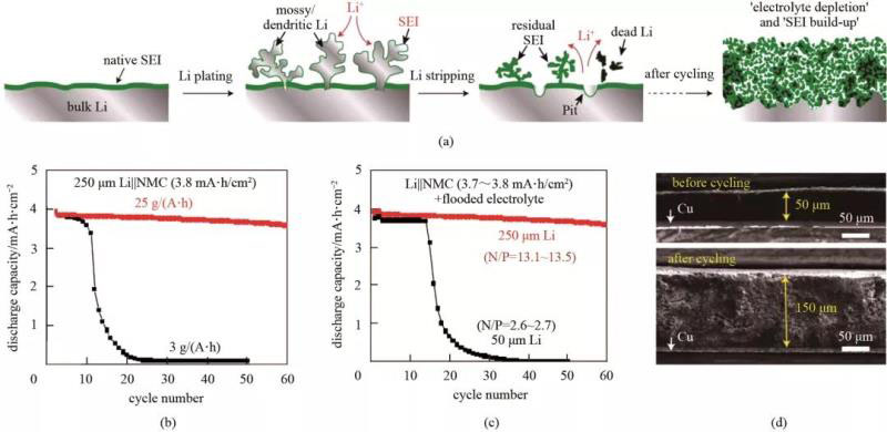 圖5 鋰負(fù)極與金屬鋰電池失效的關(guān)系。(a)金屬鋰溶解-沉積過(guò)程的形貌和結(jié)構(gòu)變化示意圖。Li‖NCM電池在不同電解液量;(b)和不同N/P比例;(c)條件下的循環(huán)性能(NCM電極:3.8 mA·h/cm2; C-rate: C/3;電壓:2.7~4.4 V);(d) 50 μm金屬鋰循環(huán)后SEM。圖片復(fù)制許可來(lái)自Nature Springer 2019