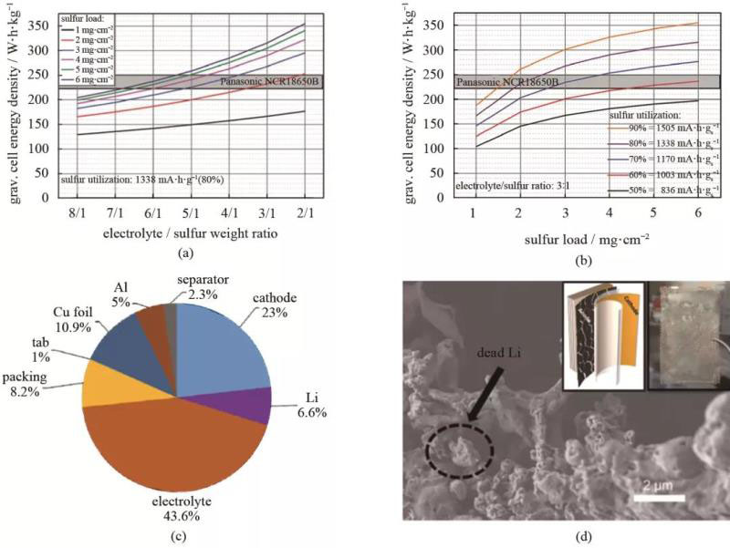 圖4 18650型鋰硫電池在(a)不同載硫量、不同E/S比例條件下能量密度的變化(固定硫利用率80%);(b)不同載硫量、不同硫利用率下能量密度的變化(固定E/S=3);(c)2.5 A·h、300 W·h/kg軟包鋰硫電池中不同電池組分的質(zhì)量分布,其中電解液的質(zhì)量分?jǐn)?shù)約為43.6%;(d)軟包鋰硫電池循環(huán)后金屬鋰負(fù)極的SEM。圖片許可復(fù)制來(lái)自Wiley 2015,ACS 2018,Elsevier 2017