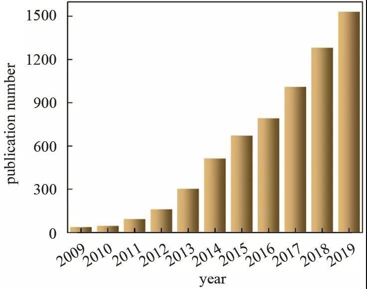 圖2 近10年內(nèi)鋰硫電池領(lǐng)域發(fā)表文章統(tǒng)計(jì)(數(shù)據(jù)來(lái)源Web of Science, 2019年12月更新數(shù)據(jù))