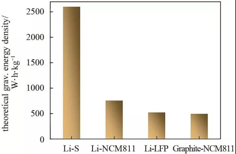 圖1 幾種不同鋰(離子)電池的理論能量密度(注:能量密度計(jì)算基于正負(fù)電極活性物質(zhì)質(zhì)量。NCM811比容量210 mA·h/g,工作電壓約3.8 V vs. Li;LFP比容量160 mA·h/g,工作電壓約3.4 V vs. Li;石墨比容量360 mA·h/g 1,工作電壓約0.1 V vs. Li;Li比容量3800 mA·h/g)