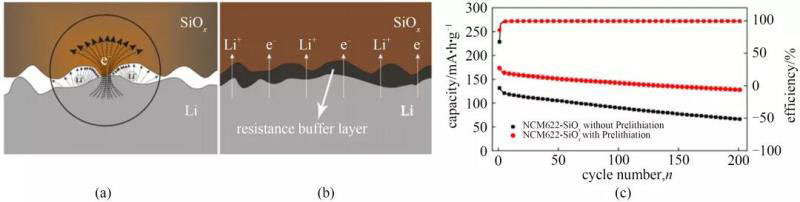 圖10 鋰離子和電子在(a)直接接觸成鋰前過程和(b) RBL調節(jié)的成鋰前過程中的轉移; (c)預鋰化負極(紅線)和未預鋰化(黑線)比容量