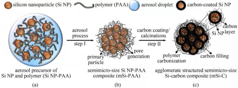 圖7 微米級硅碳復合材料團聚結構的制備原理。(a) 用于氣溶膠處理的硅納米顆粒和聚合物(PAA)前體溶液;(b) 氣溶膠誘導團聚形成的納米硅與PAA(mSi-PAA)的超結構復合材料;(c) 碳涂層/煅燒后的團塊結構硅碳復合材料(mSi-C)
