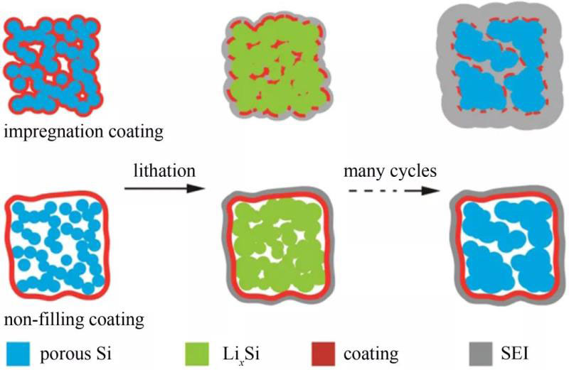 圖6 介孔硅微粒子涂層設計原理及其循環(huán)過程中的結構演變