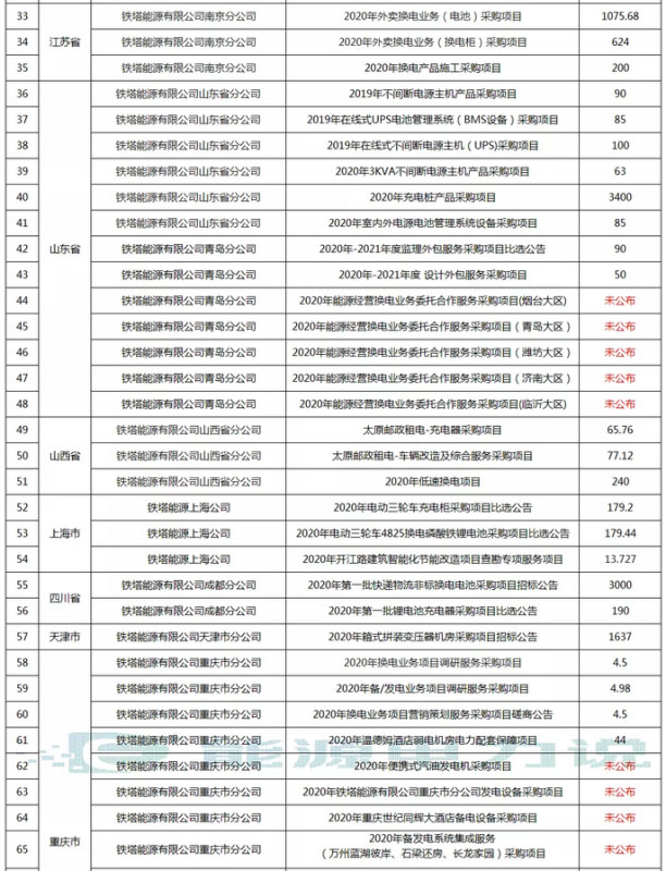 2020年截止至9月30日,鐵塔能源公司共發(fā)布采購項目71個,采購內(nèi)容主要集中在電池、換電、充電樁、智能充電柜設(shè)備及相關(guān)服務(wù)。除了14個項目未公布項目預(yù)算之外,項目預(yù)算金額合計3.4億元。