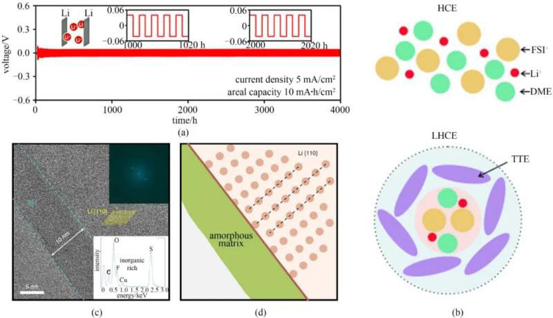 圖8 (a)使用1 mol/L LiTFSI-VC電解液的鋰/鋰對(duì)稱(chēng)電池在5 mA/cm2電流密度和10 mA·h/cm2面容量下,金屬鋰的鍍/脫鋰電壓曲線;(b) HCE(LiFSI-1.2DME)和LHCE(LiFSI-1.2DME-3TTE)的溶劑化結(jié)構(gòu);(c)沉積鋰的冷凍電鏡圖像。插圖為SEI膜的快速傅里葉變換圖(頂部)和能量色散譜(底部);(d)在1 mol/L LiFSI/DME-TFEO電解液中,鋰金屬表面形成的單層SEI結(jié)構(gòu)