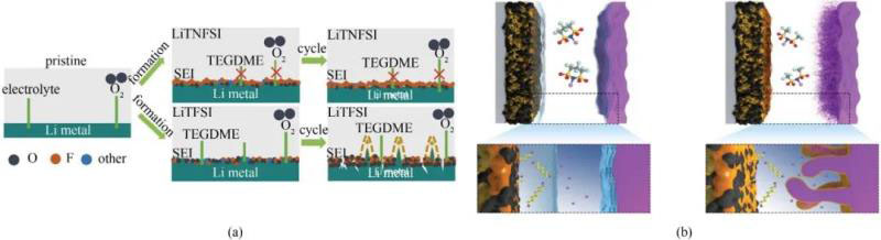 圖6 (a)鋰金屬在LiTNFSI/TEGDME和LiTFSI/TEGDME電解液中的反應(yīng)過(guò)程;(b) LiHFDF抑制鋰枝晶生長(zhǎng)和多硫化鋰溶解/穿梭的示意圖
