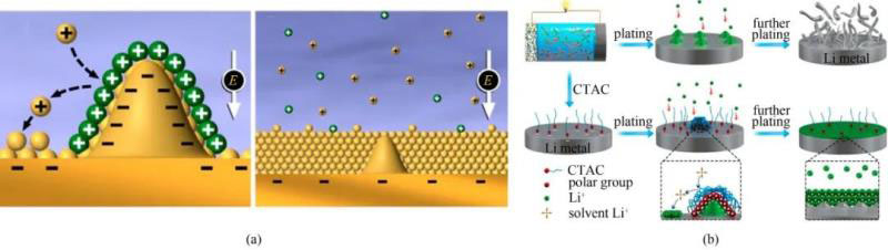圖5 (a)基于SHES機(jī)理的鋰沉積過(guò)程;(b)陽(yáng)離子表面活性劑CTAC在鋰沉積過(guò)程中的作用機(jī)理