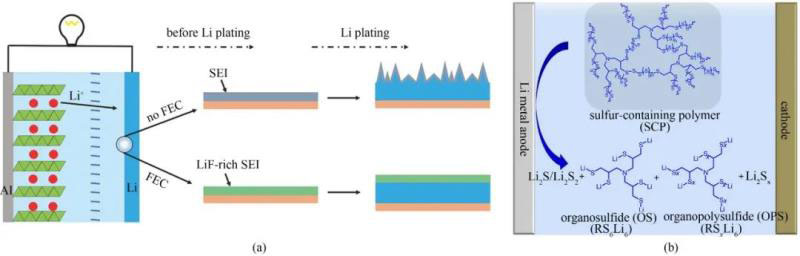 圖4 (a)加入或不加FEC的1.0 mol/L LiPF6/EC-DEC (體積比1∶1)電解液體系對(duì)鋰金屬負(fù)極的效果;(b) SCP分解后能提供有機(jī)組分(有機(jī)硫/有機(jī)聚硫化物)和無(wú)機(jī)組分(二硫化鋰/硫化鋰)的示意圖