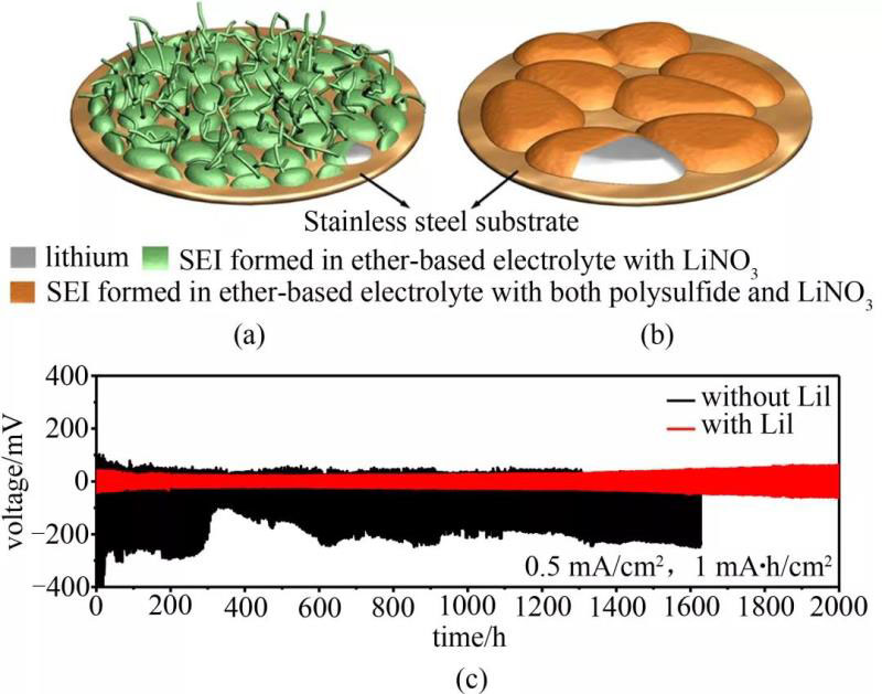 圖3 在(a)不含多硫化鋰和(b)含多硫化鋰的兩種電解液(均含有硝酸鋰)中,不銹鋼基底上鋰沉積形貌的示意圖;(c)在0.5 mA/cm2電流密度下,鋰鋰對(duì)稱(chēng)電池在不同電解液中的循環(huán)穩(wěn)定性