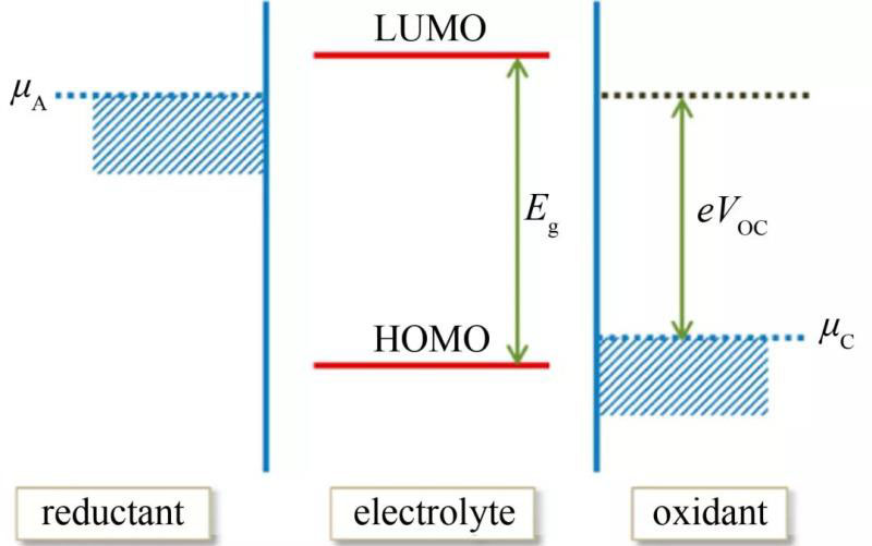 圖2 電極和電解液無(wú)反應(yīng)時(shí)電解液(固體電極體系的液體電解液)窗口Eg和電極電化學(xué)電位μA和μC的相對(duì)能量
