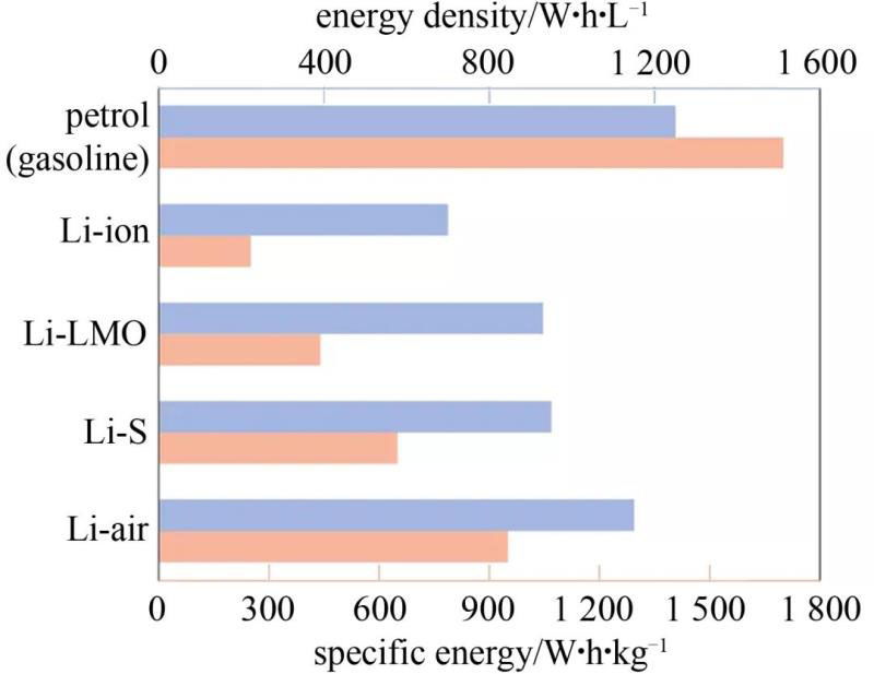 圖1 汽油、最先進(jìn)的鋰離子電池及3種鋰金屬電池的實(shí)際比能量(粉紅色)和能量密度(藍(lán)色)對(duì)比