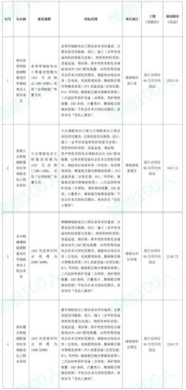 “儲能100人”獲取的招標文件顯示,本次項目EPC招標分為四個標包分別招標,其中郴州韭菜坪規(guī)劃建設(shè)22.5MW/45MWh、婁底九侖7.5MW/15MWh、永州螞蟥塘20MW/40MWh、邵陽磨石10MW/20MWh,四地合計60MW/120MWh,與湖南電網(wǎng)側(cè)儲能一期規(guī)模相同。