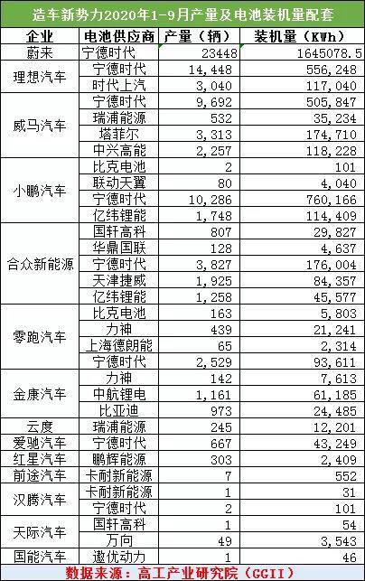 在此背景下,高工鋰電梳理了2020年1-9月新勢力企業(yè)和車型產(chǎn)量情況,及相應的電池配套,具體如下: