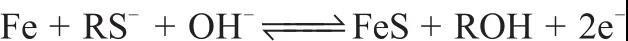 同樣利用含硫物質(zhì)的吸附來提高析氫過電位,Yang等向電解液中添加含硫的有機(jī)化合物,通過有機(jī)硫化物在鐵電極的吸附來減弱析氫,同時有機(jī)硫化物在鐵電極的強(qiáng)吸附導(dǎo)致一些硫元素融進(jìn)鐵電極,即發(fā)生式(17)的反應(yīng),生成鐵的硫化物,緩解電極Fe(OH)2層的絕緣性,提高了電極的倍率性能。長鏈硫醇能夠形成緊密的自組裝吸附層,析氫速率比購買的商業(yè)電極降低80%。二硫醇、硫醚和芳香硫醇的抑制效果也不錯,但弱于長鏈硫醇。緊密吸附的有機(jī)硫化物不容易在電極反應(yīng)過程中被氧化,穩(wěn)定性優(yōu)異。Souradip等在電解液中少量加入直鏈硫醇,能夠在鐵電極表面組成自組裝的單層,硫醇分子外側(cè)的疏水基團(tuán)起到隔離水的作用,減少了能接觸到電極表面的水,降低了析氫反應(yīng)速率。直鏈硫醇直鏈碳原子數(shù)大于6時,析氫反應(yīng)速率能夠降低90%。