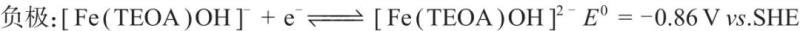Gong等將Fe(III)/Fe(II)-三乙醇胺(TEOA)電對與Fe(CN)63-/Fe(CN)64-電對組成電池,首次提出堿性環(huán)境下的全鐵液流電池,正負(fù)極反應(yīng)為式(18)和式(10),正極電對的電極電勢在0.5 mol/L離子濃度下能達(dá)到0.44 V(vs. SHE),電池電壓為1.34 V;且螯合物電對反應(yīng)的標(biāo)準(zhǔn)速率常數(shù)高于電對Fe3+/Fe2+;電池在40 mA/cm2電流密度下電池電流效率為93%,能量效率為73%,峰值功率密度為160 mW/cm2;能量效率較低主要是由于溶液中自由存在的TEOA對膜的污染導(dǎo)致膜的電阻變大,降低了電壓效率,同時交叉滲透的TEOA會被正極的Fe(CN)63-氧化,降低電池的電流效率,因此該堿性全鐵液流電池技術(shù)的關(guān)鍵在于耐TEOA膜的研發(fā)。