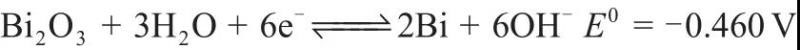 電極中加入氧化鉍也能一定程度抑制析氫反應(yīng)的進(jìn)行,由于還原生成的金屬鉍形態(tài)不同導(dǎo)致析氫電流仍然比加入Bi2S3大60%,電極中氧化鉍主要發(fā)生式(16)的反應(yīng)。