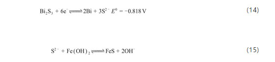 Manohar等往電極中加入Bi2S3后,充電過程Bi2S3會發(fā)生式(14)的還原反應(yīng),由于Bi被還原的電位比鐵電極的電位正,Bi2S3先被還原成金屬Bi,金屬Bi的高析氫過電位極大地抑制了電極的析氫,且放電過程中不會達(dá)到金屬Bi被氧化的電位,故金屬Bi能穩(wěn)定地抑制電極的析氫。電極中還原硫化鉍得到的硫離子與Fe(OH)2反應(yīng)生成FeS[式(15)],鐵的硫化物與硫離子作用生成多種價態(tài)的鐵硫化物,解決了放電生成絕緣的Fe(OH)2的問題,電池能夠在高倍率放電的同時獲得較高的比容量。