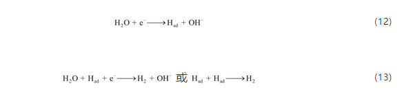通過向電解液中加入添加劑來抑制析氫和提高電極的循環(huán)穩(wěn)定性,與鐵電極具體反應(yīng)過程密切相關(guān),研究表明硫化物能夠減輕電極的鈍化并且能夠提高電極高倍率下的放電性能:硫離子能夠?qū)﹁F的氫氧化物膜產(chǎn)生作用,增加氫氧化物膜中的缺陷,提高鈍化層的導(dǎo)電性;硫離子與電極氧化層中存在的Fe(Ⅰ)、Fe(Ⅱ)和Fe(Ⅲ)相互作用,使氧化層破裂,促使更多電極中的鐵氧化成Fe(Ⅱ)和Fe(Ⅲ),提升電極的容量,硫離子對Fe3O4膜的作用較小,但是Fe3O4本身有一定導(dǎo)電性,對電極性能影響較小;電極表面的吸附作用能夠使硫離子進(jìn)入晶格,從而使電極表面形態(tài)發(fā)生變化,提高活性面積。之所以能夠抑制析氫是由于添加劑中的硫離子能吸附在電極表面,而電極上發(fā)生析氫反應(yīng)主要有兩種路徑,如式(12)和(13)所示