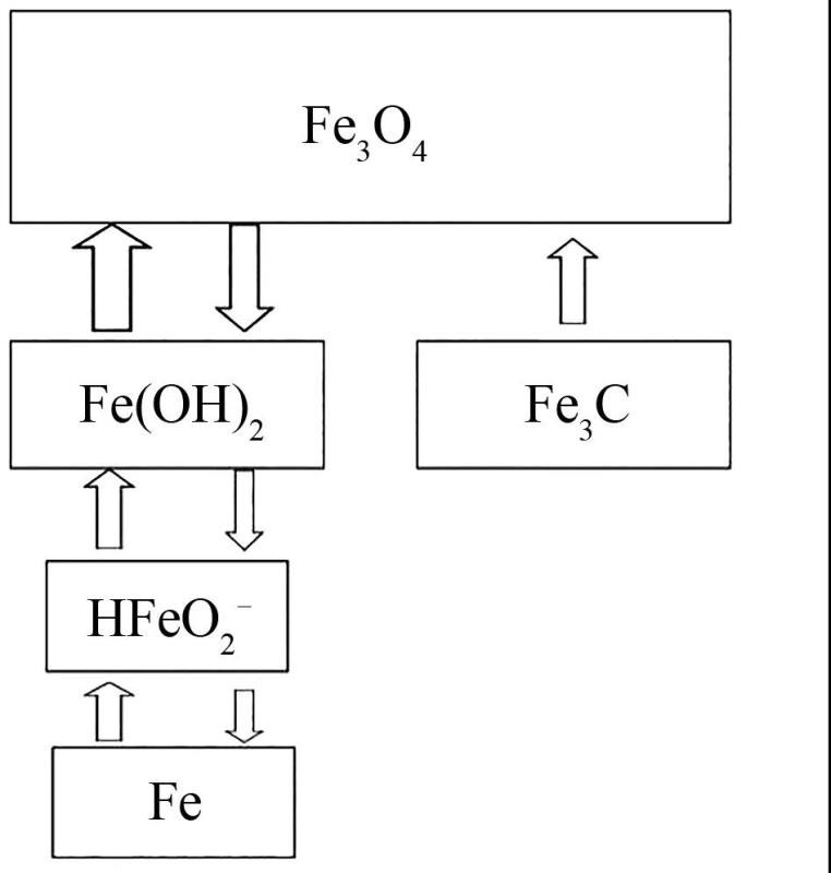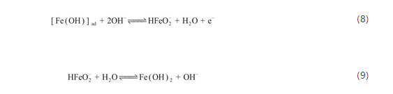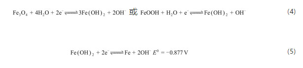 而大多數(shù)學(xué)者認(rèn)為Fe(OH)2的形成是要通過可溶的中間體HFeO2-,見式(8)和(9)